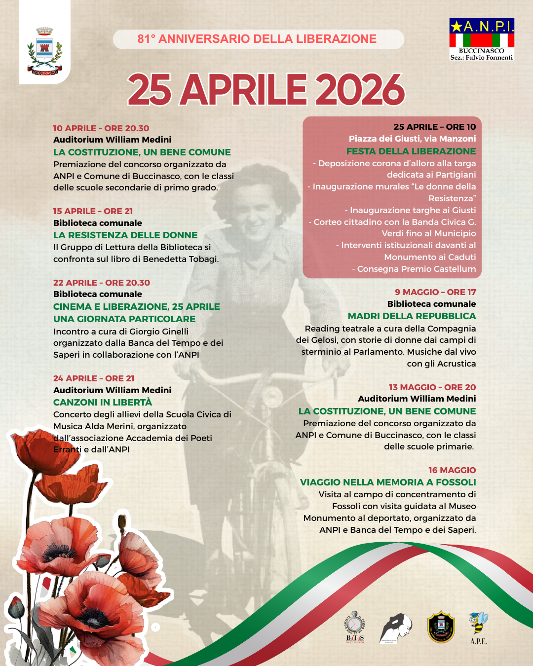 Cerimonia civile in occasione del 25 Aprile con la deposizione della corona d’alloro alla targa dedicata ai Partigiani, l’inaugurazione delle targhe dei Giusti nel parco e a seguire corteo cittadino fino al Municipio, dove si terrà la deposizione della corona d’alloro al Monumento ai Caduti, gli interventi istituzionali e la consegna delle benemerenze civiche (Premio Castellum).