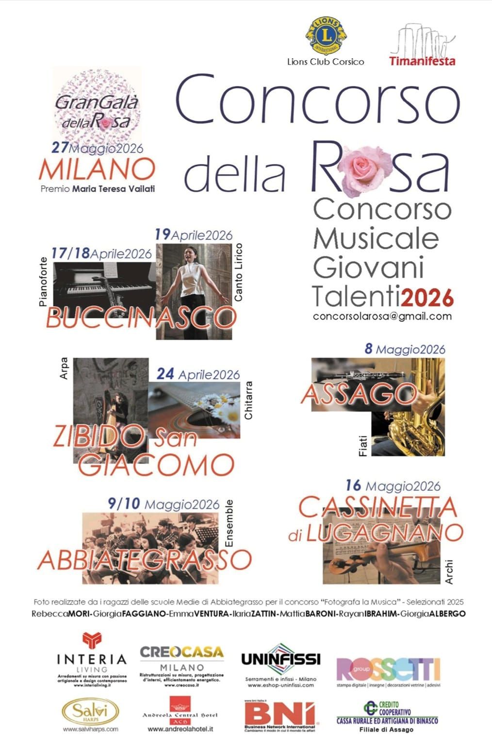 "Concerto della Rosa: concorso musicale Giovani Talenti - Premio "Maria Teresa Vailati", l'associazione culturale Timanifesta presenta, col patrocinio del Comune di Buccinasco, un concorso nazionale di pianoforten e archi dedicato ai giovani talenti.