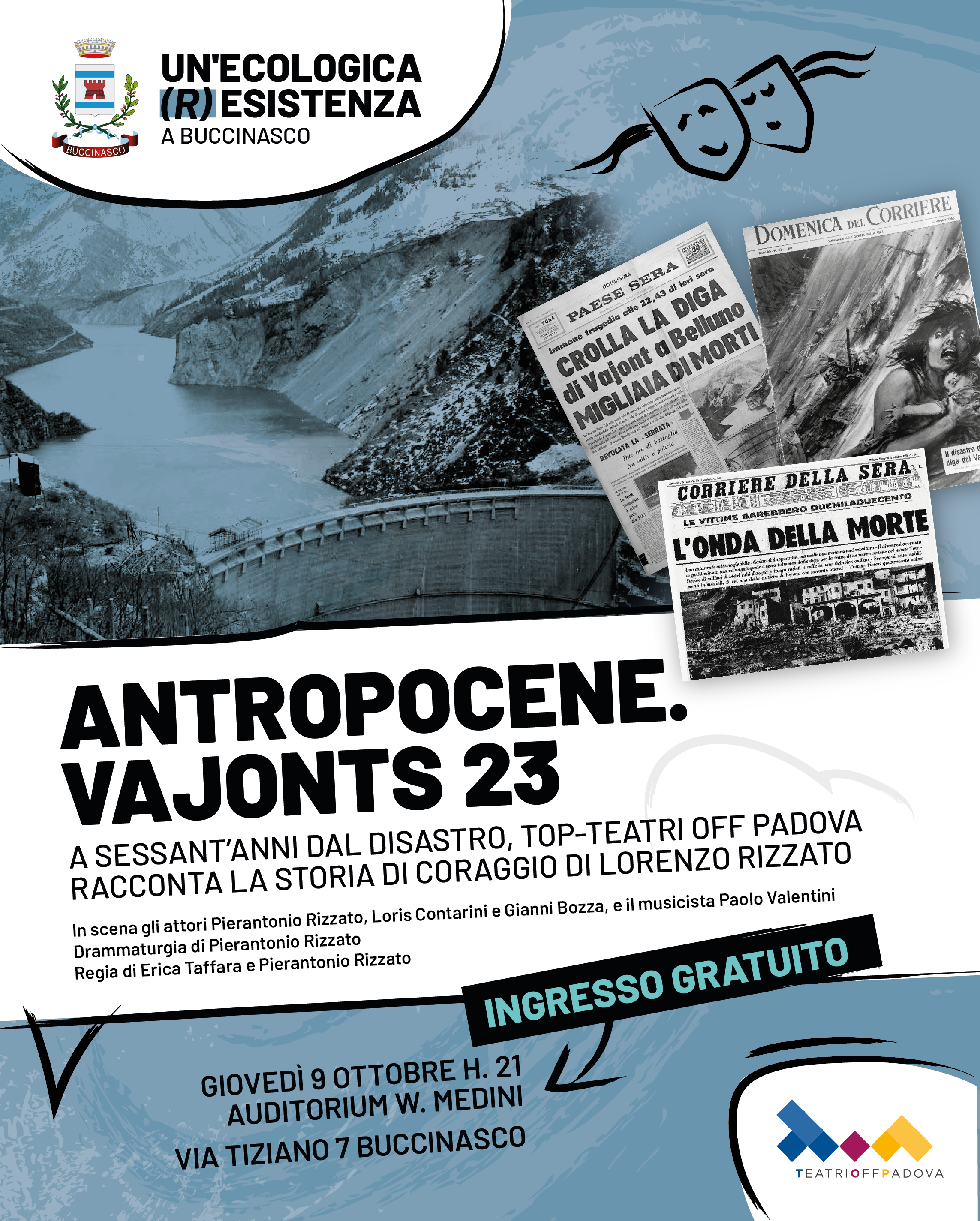 A 62 anni dalla tragedia, Buccinasco ricorda il disastro ambientale che segna la storia italiana con lo spettacolo “Antropocene, VajontS 23” della produzione TOP – Teatri OFF Padova. L’appuntamento è in programma giovedì 9 ottobre all’Auditorium William Medini di via Tiziano 7 alle ore 21, con ingresso libero e gratuito. Si tratta dell’adattamento drammaturgico del testo teatrale di Marco Paolini, a cura di Pierantonio Rizzato che vi integra anche altri brani.