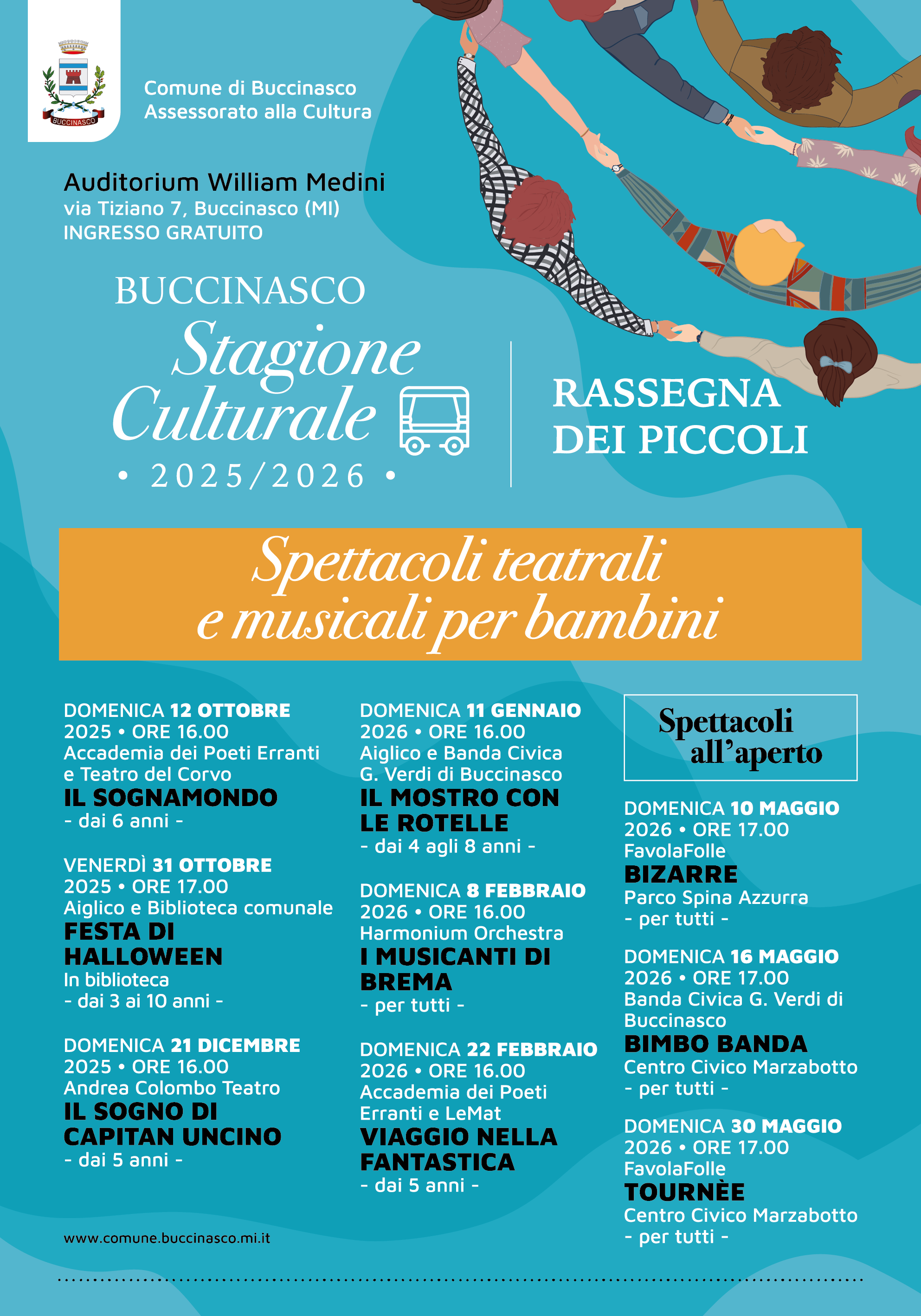 Buccinasco (10 ottobre 2025) – Nell’ambito della Stagione culturale 2025/2026 promossa dal Comune di Buccinasco, l’assessorato alla Cultura conferma (e amplia con spettacoli primaverili all’aperto) la “Rassegna dei Piccoli”, dedicata a bambini e ragazzi. Un appuntamento gratuito imperdibile da tante famiglie di Buccinasco che da anni apprezzano gli spettacoli teatrali e musicali proposti.