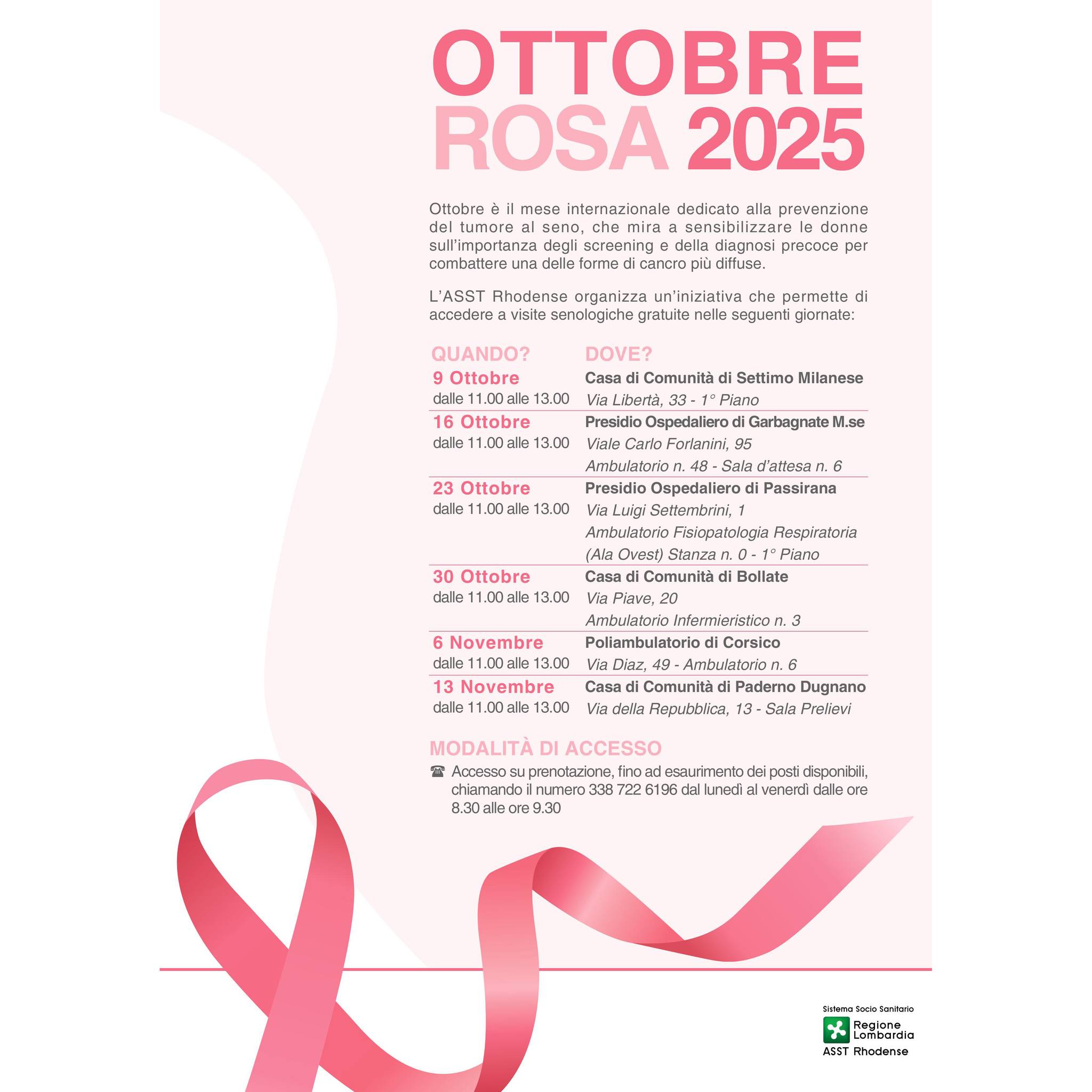 Tante donne, però, rimandano i controlli o non vi accedono: per questo, in occasione di “Ottobre Rosa”, l’ASST Rhodense organizza un’iniziativa che permette di accedere a visite senologiche gratuite su prenotazione, nelle seguenti giornate: